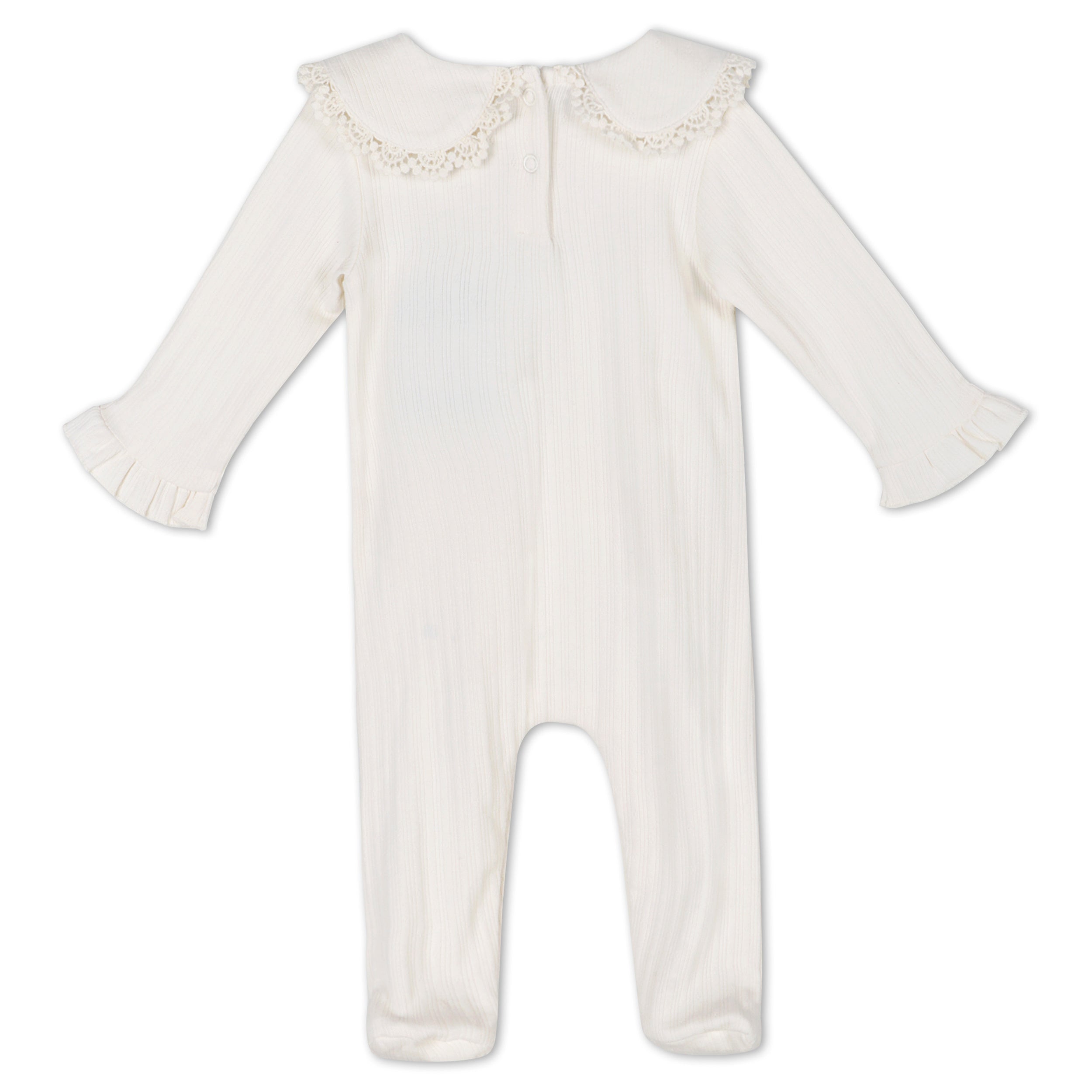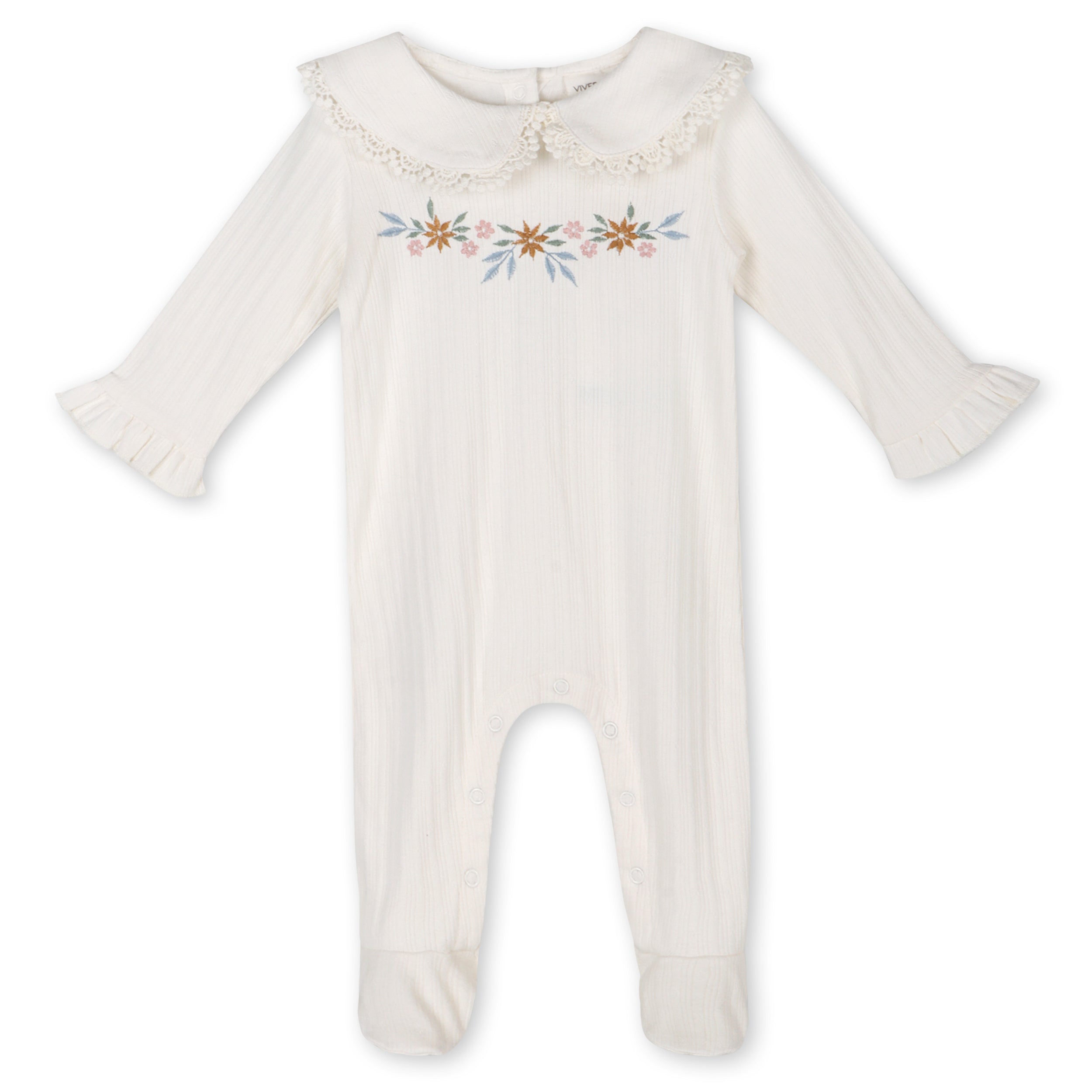 - Pointelle fabrication with ruffle collar and floral embroidery detail baby girl footed jumpsuit.