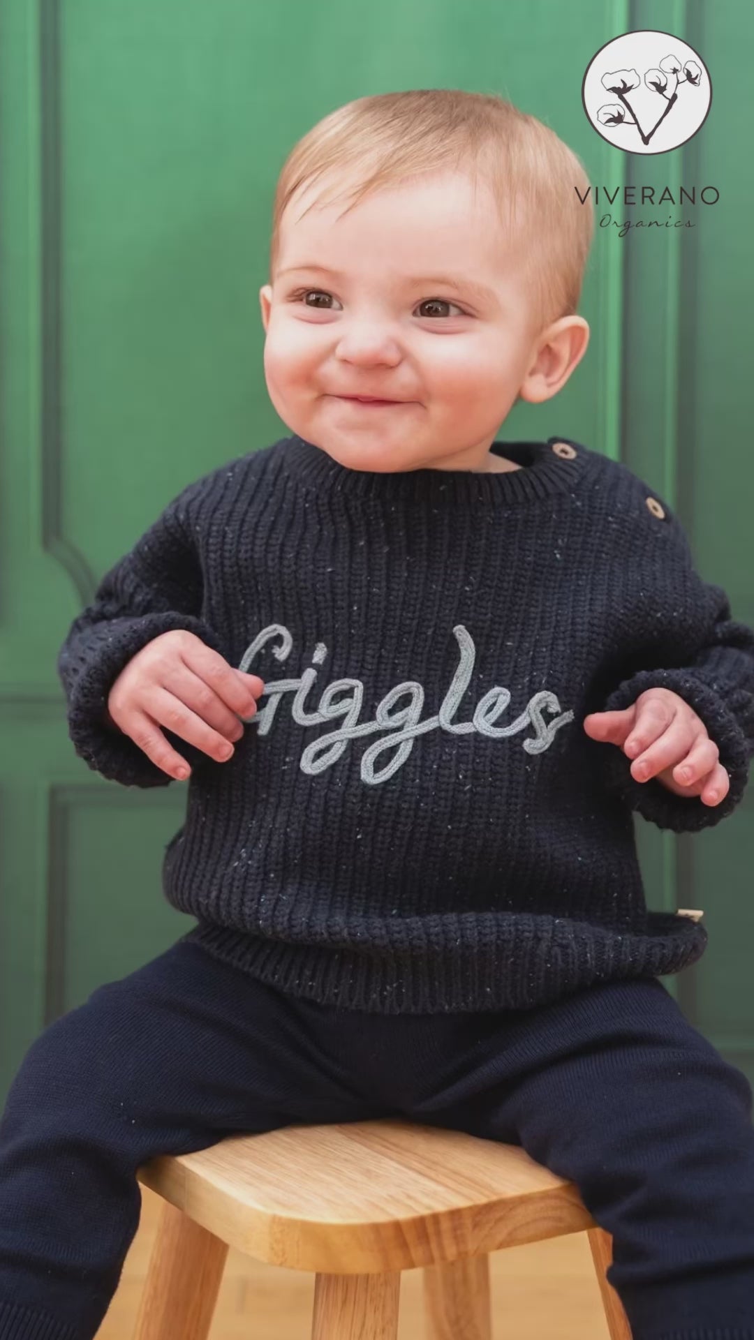 -100% organic cotton long-sleeve baby pullover sweater, chunky knit, cute slouchy fit, and featuring Giggles embroidery in the front.