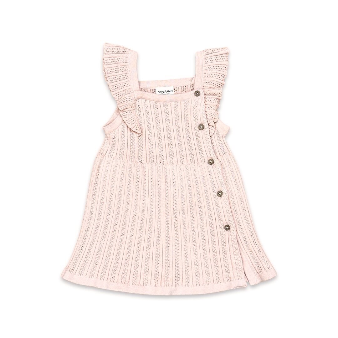 Adorable organic cotton sweater knit sleeveless baby dress with ruffles.